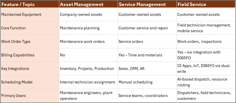 Choosing between Asset Management, Service Management, and Field Service in the Microsoft ecosystem depends on who owns the asset, who performs the service, and how service is delivered.