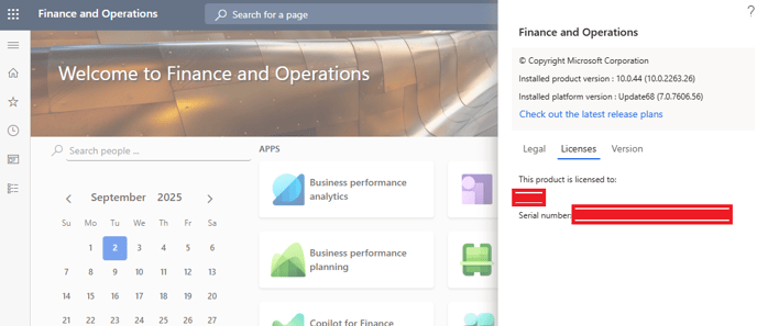- Serial number of Dynamics 365 for Finance and Operations