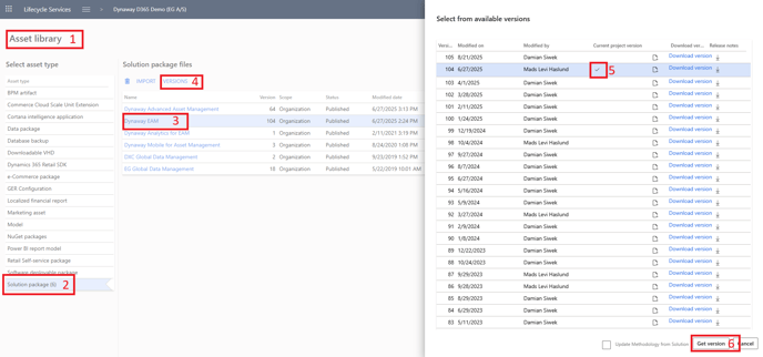 Verify that the version is compatible with the version number of Dynamics 365 for Finance and Operations. - You must manually select the correct version of the solution package. Every time Dynaway publishes an updated version of Dynaway EAM, it is automatically available in the versions list. Please refer to the Release Notes to identify if a version of Dynaway EAM is compatible with a specific version of Dynamics 365 for Finance and Operations