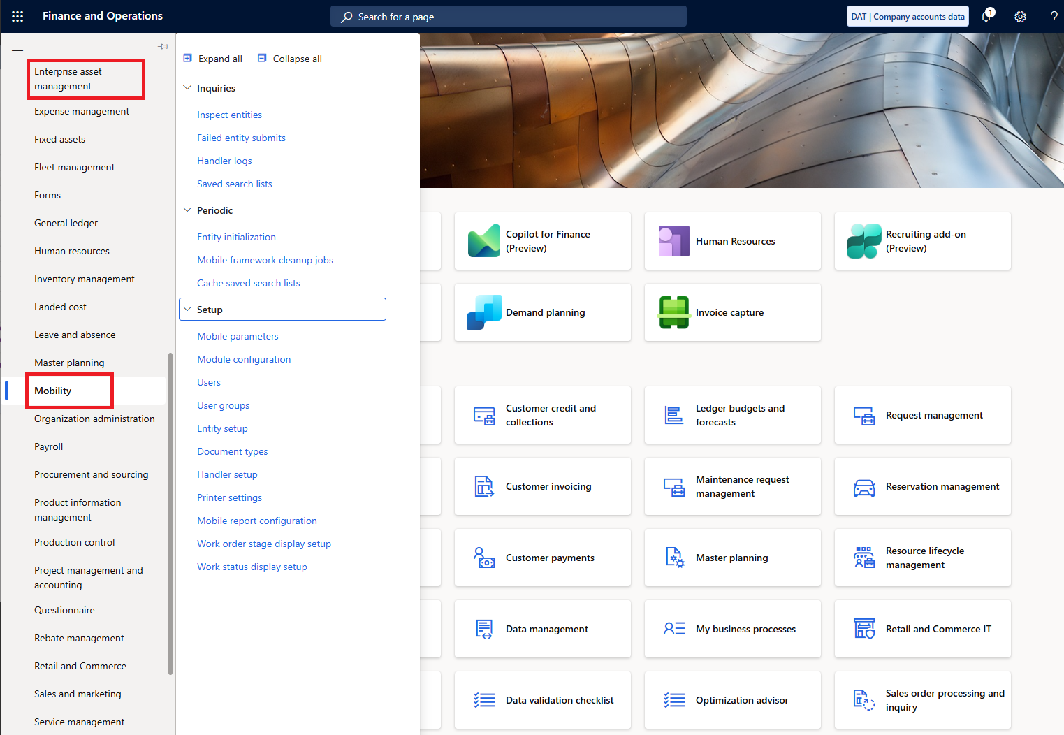 Open Dynamics 365 for Finance and Operations to verify the Dynaway mobility module is available in the main menu of Dynamics 365 for Finance and Operations.