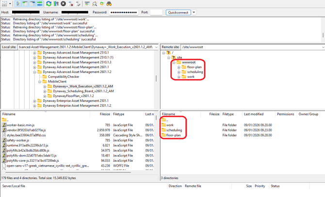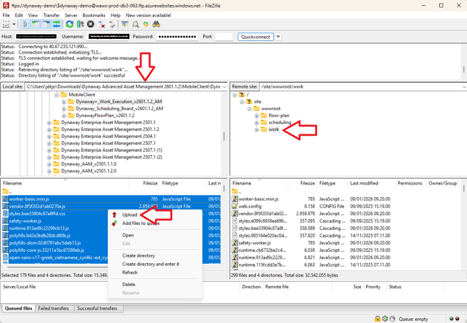 Drag and drop files to the FTP /work, /plan and /safe directory. Make sure the web.config file is up to date.