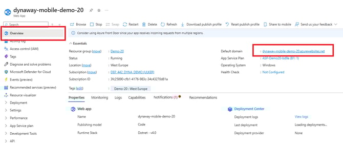 This URL must be the same as when setting up the Azure Mobile Site, described in the article Add the Azure app, taken from "Overview" and added https:// - Select Register and wait for the resource to deploy.