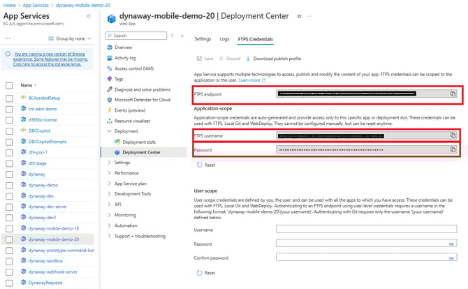 2. Go to Azure app service --> deployment center, copy & paste credentials, and connect to the FTP server.