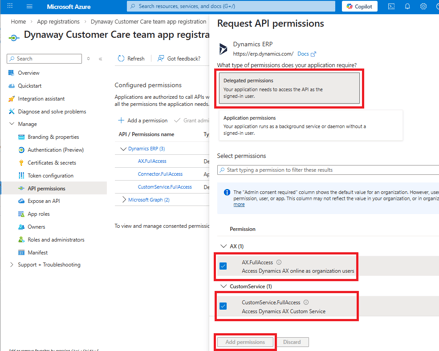 04: Select Delegated permissions mark AX.FullAcess and CustomService.FullAccess click Add permissions